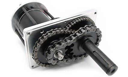 The 1:19 reducer is designed for higher torque than the other reducers. The first two reduction stages are done with #25 and #35 roller chains. But, unlike the other reducers, a #40 chain is used for the final stage. With a torque capacity of 480 pound-feet, it can handle 60% more torque than the 1:27 reducer.